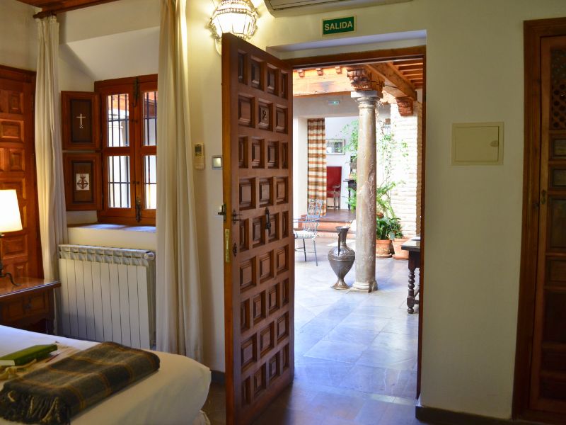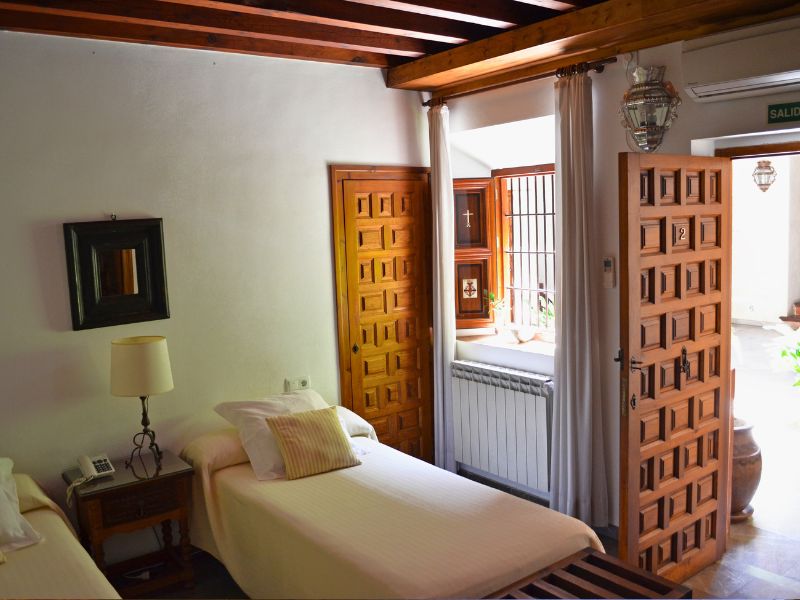 Las habitaciones dobles básicas del hotel son unas preciosas estancias, cálidas y confortables, ideales para disfrutar el encanto de una escapada el Granada al mejor precio y disfrutar el encanto de tener vistas a un patio andaluz desde la ventana.
